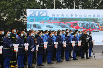 当天下午15时00分,街面突发事件应急处置演练正式开始。本次演练共分为五个科目,分别是常规灭火器扑救初期火险演练、新能源公交车充电起火处置演练、公交BRT站厅突发事件的处置演练、公交车遇暴恐事件的应急处置演练和长棍术、擒敌拳、棍盾组合及擒敌术表演。公交车遇暴恐事件的应急处置演练科目将现场气氛推到高潮。演练中,两名“歹徒”随着人群上车后,在车厢持刀劫持乘客,砍伤驾驶员劫车逃逸并在车内纵火,驾驶员在危急关头拼命按下一键破玻器、一键报警装置后。接到报警后,多警种追击歹徒成功解救“人质”、多部门相继赶到阻击现场进行处置。该科目整个演练过程接近实况,有效检验了多警种、多部门、多要素面对反恐防暴、灭火救援的快速反应和协调作战能力,增强了应对街面突发事件的决策指挥、协调组织和临机处置能力。第二现场的公交BRT站厅突发事件的处置演练也扣人心弦,现场模拟公交BRT站厅一进站乘客不佩戴口罩、不亮健康码、携带可疑物品并抓扯推搡安保人员强行冲进闸机口进站,在站厅纵火,站厅安保人员临危不惧,第一时间反应处置灭火并报警,事件得到有效控制。本次应急处置演练过程组织周密、处置严谨,突出了指挥高效、协同配合、快速反应、紧贴实战的特点,达到了预期目标。